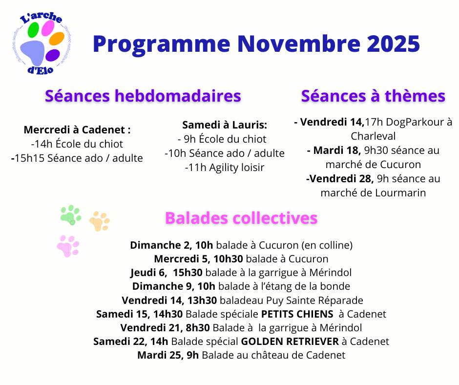 Les séances collectives, se déroulent soit au terrain d’éducation canine à Lauris (D59), à côté du canoë (Google Maps et Waze vous y mèneront si vous entrez L’arche d’Elo), soit au terrain de Cadenet (situé au 1440, route de Marseille), soit en extérieur notamment pour les séances en ville. Le lieu de la séance est précisé lors de votre inscription sur MyKookie.